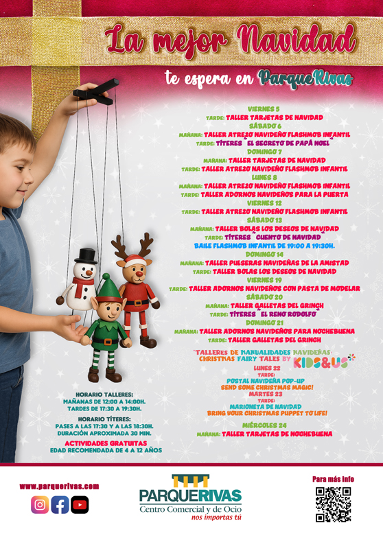 La Mejor Navidad Volver LA MEJOR NAVIDAD TE ESPERA EN PARQUERIVAS HORARIO TALLERES: MAÑANAS DE 12:00 A 14:00H. TARDES DE 17:30 A 19:30H. HORARIO TÍTERES: PASES A LAS 17:30 Y A LAS 18:30H. DURACIÓN APROXIMADA 30MIN. Actividades gratuitas Edad recomendada de 4 a 12 años Project detailsLikes:5Author:Date:Categories:Eventos