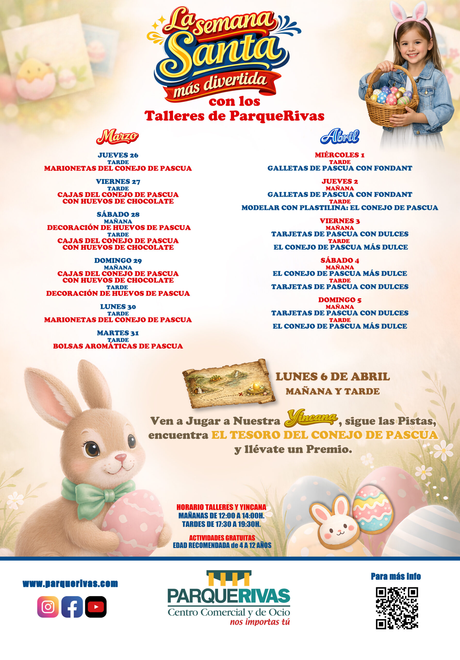 La Semana Santa más divertida Volver LA SEMANA SANTA MÁS DIVERTIDA CON LOS TALLERES DE PARQUERIVAS HORARIO: MAÑANAS DE 12:00 A 14:00H. TARDES DE 17:30 A 19:30H. Talleres infantiles gratuitos Edad recomendada de 4 a 12 años Detalles de NoticiasLikes:0Author:Date: